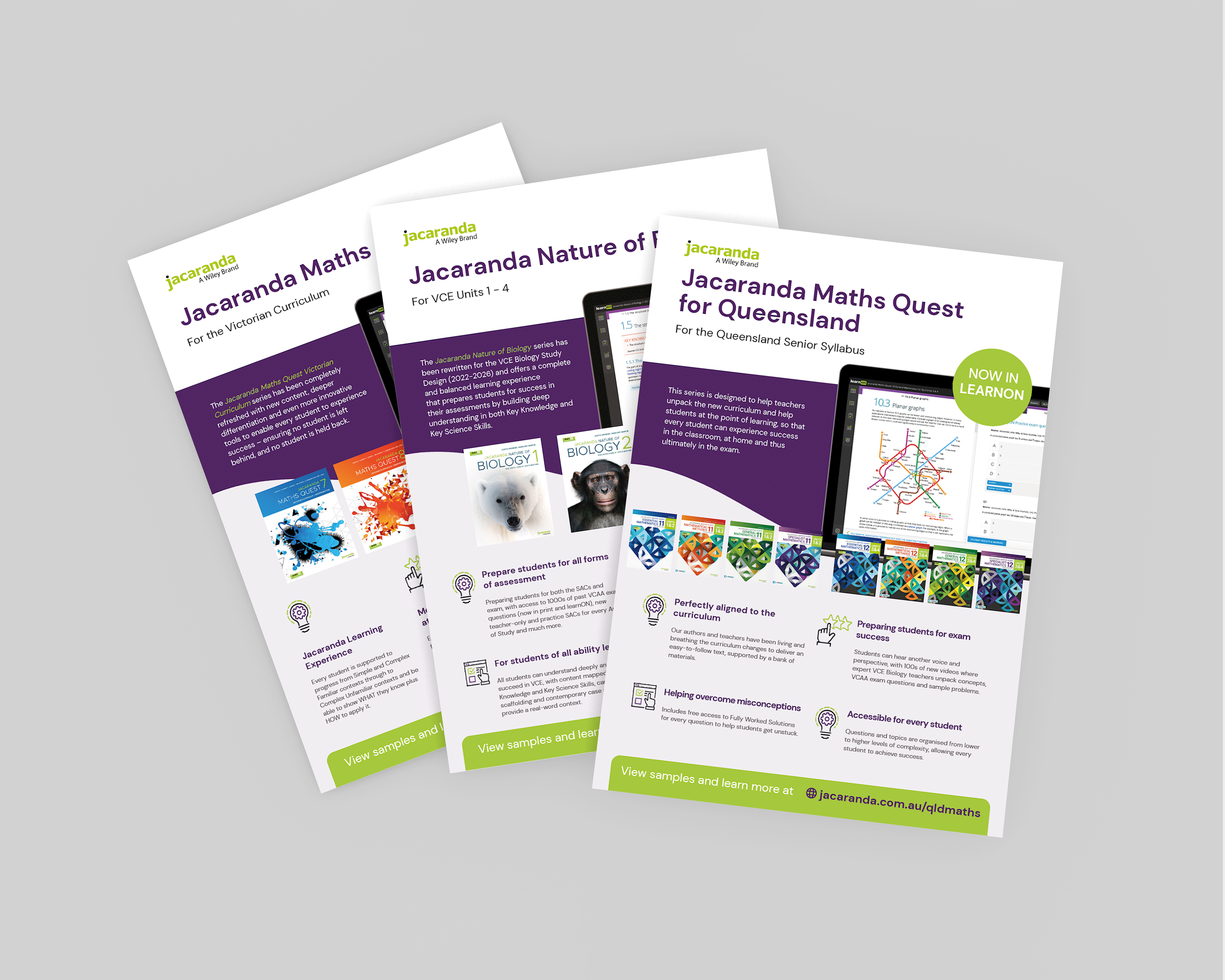 Print and design work for Jacaranda—the secondary education subsidiary of global publishing brand Wiley—showcasing their frontlist titles including e-learning environment.